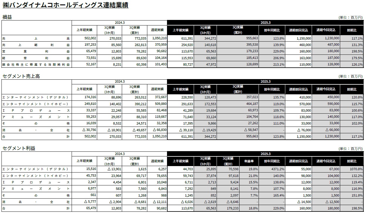 [バンダイナムコHD: 2025年3月期 第3四半期決算短信〔日本基準〕(連結) / 補足資料 / 決算説明会プレゼン資料 / 通期業績予想および配当予想の修正に関するお知らせ](pdf)