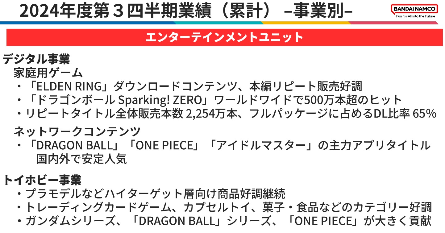 前期の損失計上に加えて今期は「ELDEN RING」のDLCや「ドラゴンボール Sparking! ZERO」のヒット、スマゲ「学園アイドルマスター」もスタートが順調と好調な要因が多く増収、大幅増益となっています。
