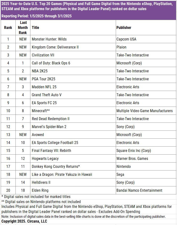February 2025 U.S. Video Game Market Highlights from Circana - February 2025 projected U.S. consumer spending on video game hardware, content and accessories declined 6% when compared to YA, to $4.5B. Spending so far this year is 11% lower than 2024 YTD, at $9.0B.