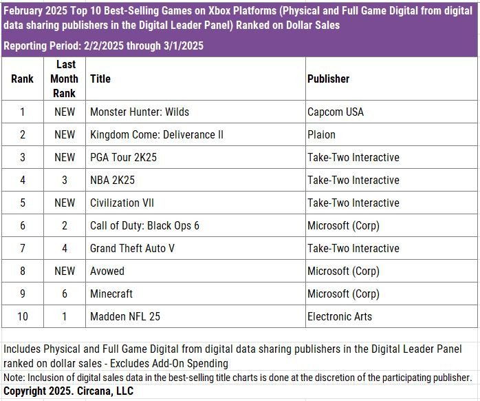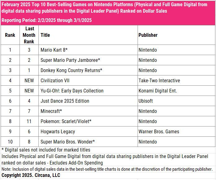米Circana(旧NPD)の2025年2月集計は全体の売上高が前年同月比6%減の45.07億ドル、ゲームコンテンツが4%減の40.31億ドル、ゲーム機が25%減の2.56億ドル、周辺機器が8%減の2.2億ドルと全体的にはやや減収、ゲーム機が顕著に減少する結果に。