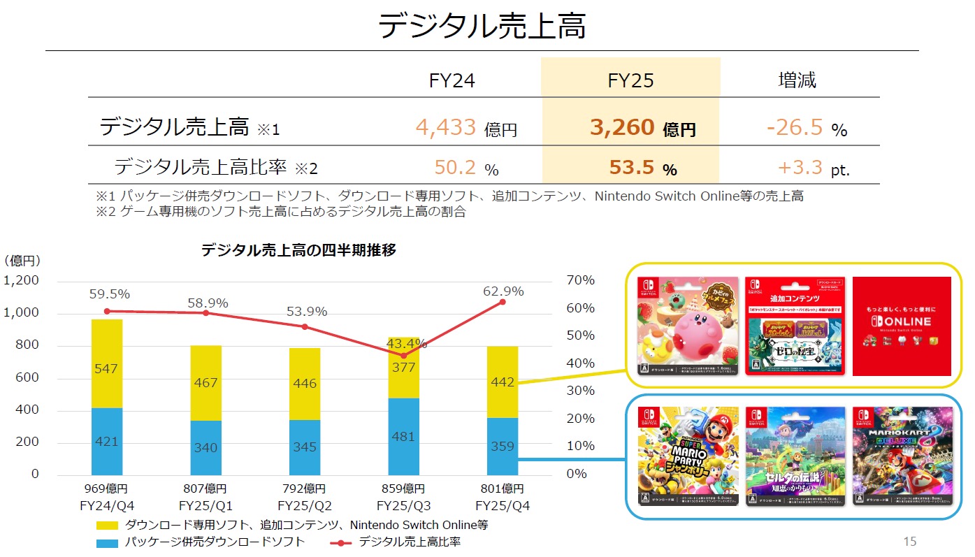 デジタル売上高は前期比で大幅減となる一方、デジタル売上高比率は第4四半期に62.9%と(任天堂にしては)高い比率に。