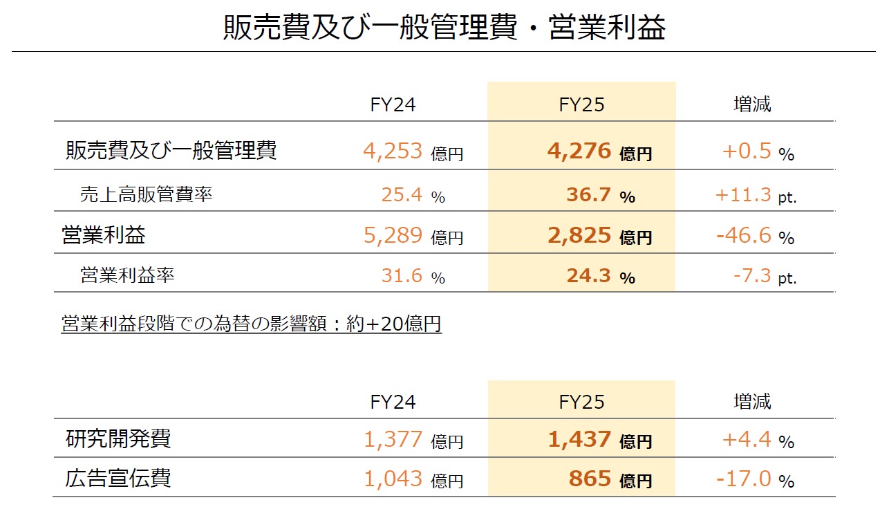 営業利益に対する為替影響は+20億円と売上高に比べると低めに、研究開発費は前年度から微増の1437億円。