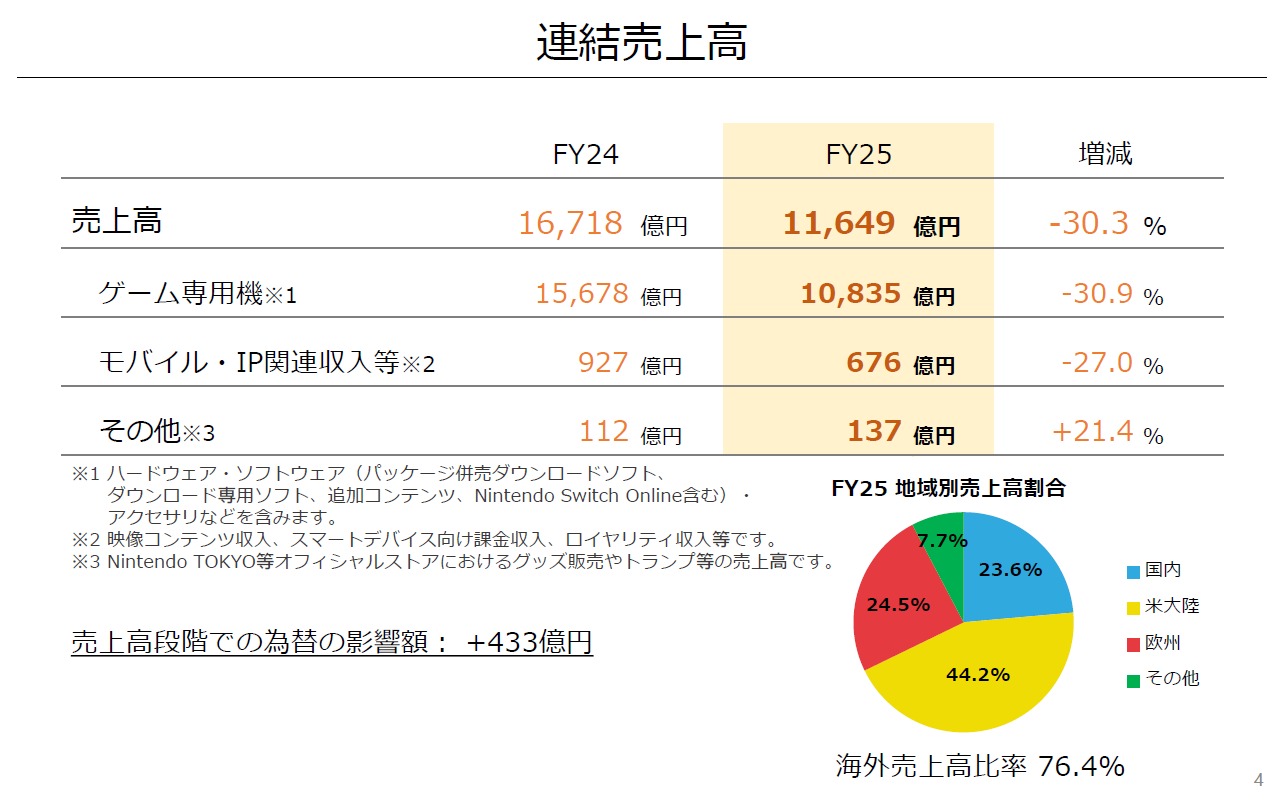 任天堂の2025年3月期通期決算は、売上高が前期比30.3%減の1兆1649.22億円、営業利益が46.6%減の2825.54億円、経常利益が45.3%減の3723.16億円、純利益が43.2%減の2788.06億円と大幅減収減益。