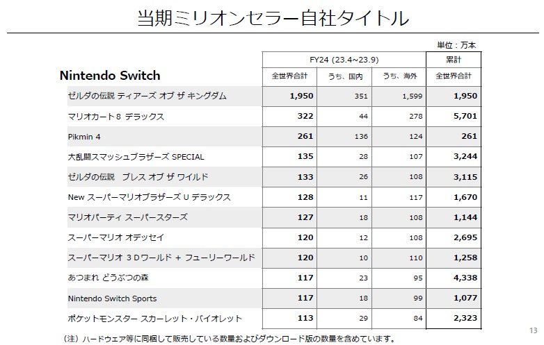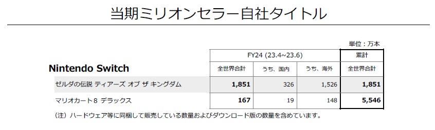 特に第2四半期~第3四半期、ゼルダのティキンは国内で13万本しか増えてないんですよね。