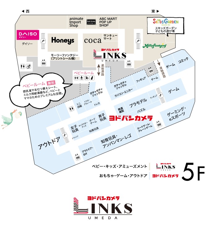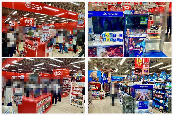 該当フロアのマップがこれ、リンクスとの連絡通路が任売り場にある事から、「↓連絡通路」とある部分のゲーム売り場を跨ぐように任コーナーになっているのだと思いますけど(※梅ヨドに行った事がない。京都ヨドには行った事あります)、任売り場は通路を挟んで広く撮影しているのに対してPS売り場(と称する写真)は什器のどアップと、右にグッズ売り場が写っている事から恐らくゲーム売り場の外れの方を狙って撮るという任天堂らしさを発揮しているのでしょう。