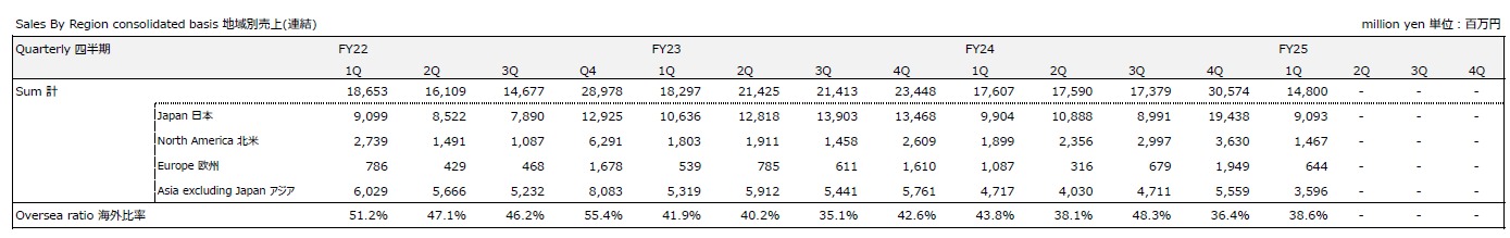 地域別売上高は今期(FY25 1Q)において極めて国内に偏っていますね。