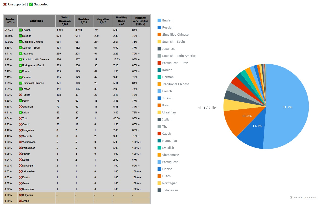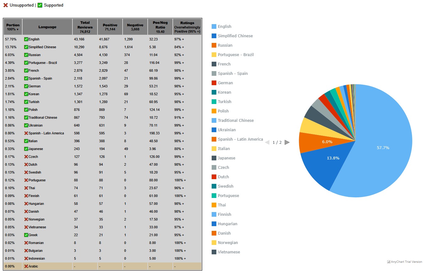 これに次ぐ言語は簡体字中国語の84%で、最もレビュー数比率が高い英語の高評価率97%とは大きく差が付いています。
