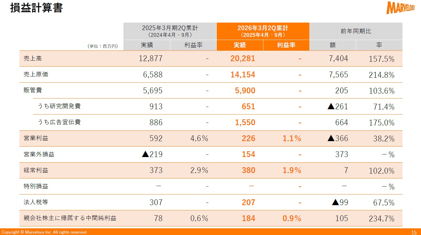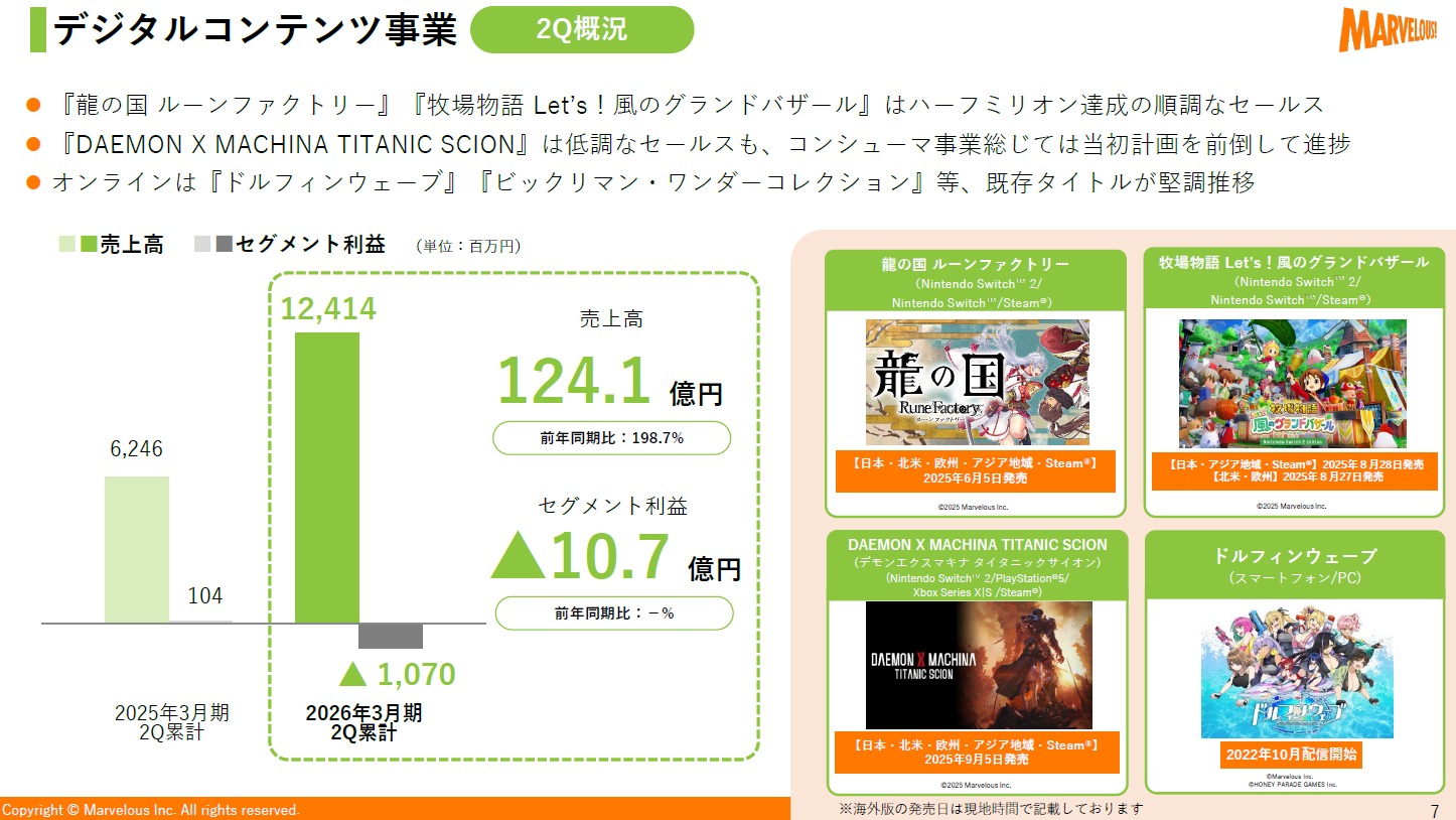 [マーベラス: 2026年3月期第2四半期(中間期)決算短信〔日本基準〕(連結) / 決算説明資料 / 決算説明概要](pdf)