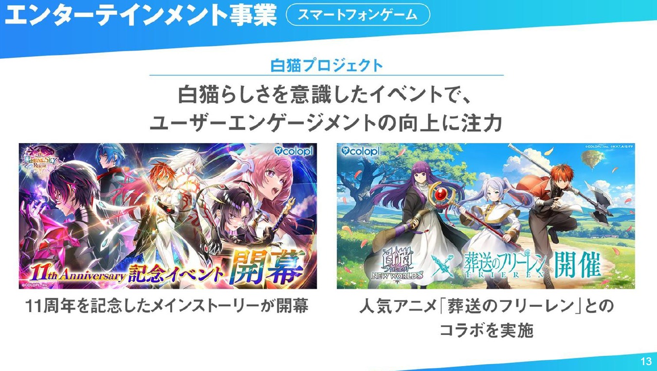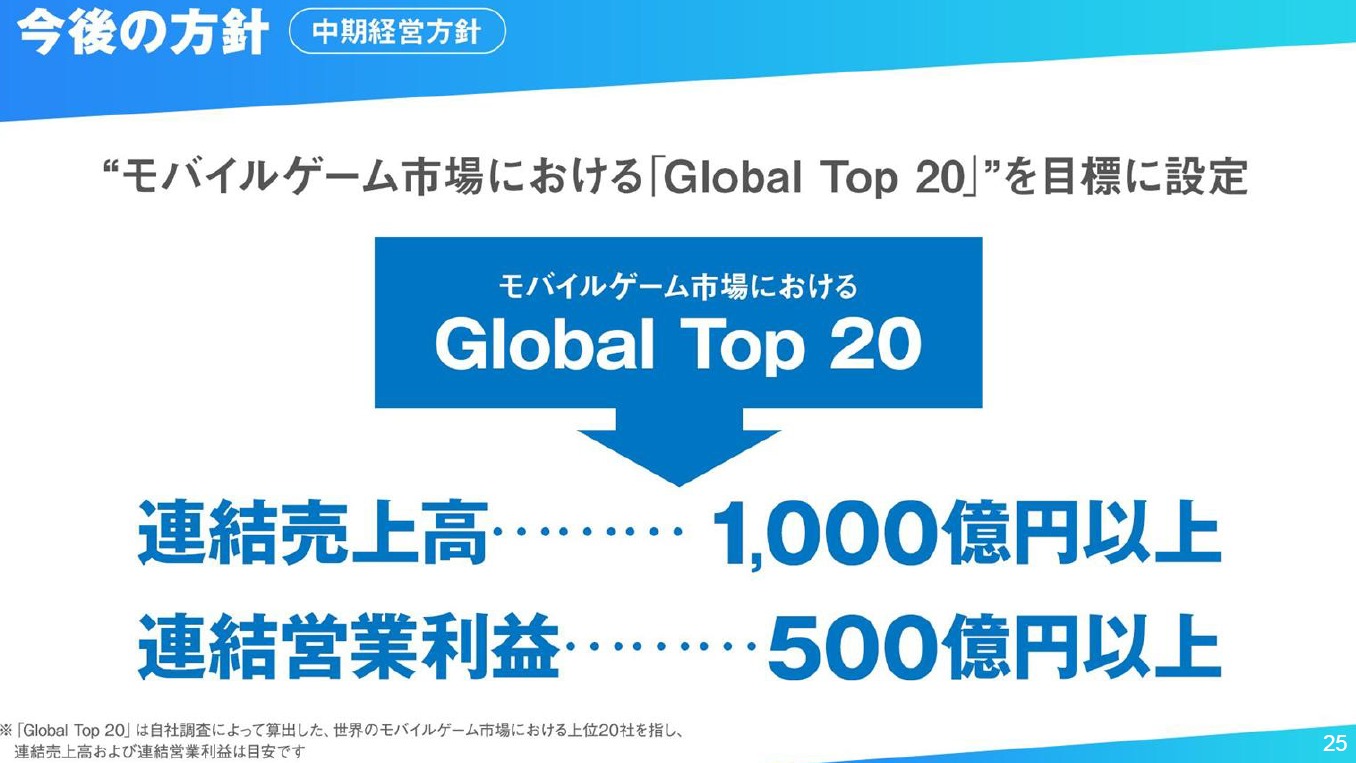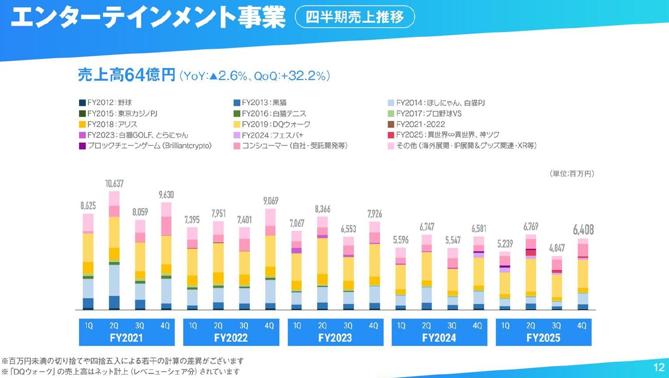 近年のモバイルゲーム市場環境はより厳しさを増しており、新作タイトルのヒット創出が年々難しくなっております。当社グループの中核事業であるエンターテインメント事業も2025年9月期は営業赤字となり、厳しい状況が継続していると認識しております。当社はエンターテインメントを主軸として長期的な事業の安定性と企業の持続可能性を高めていくために、ポートフォリオ戦略の見直しや新たな開発プロセスの構築など、さまざまな改革に取り組んでいます。