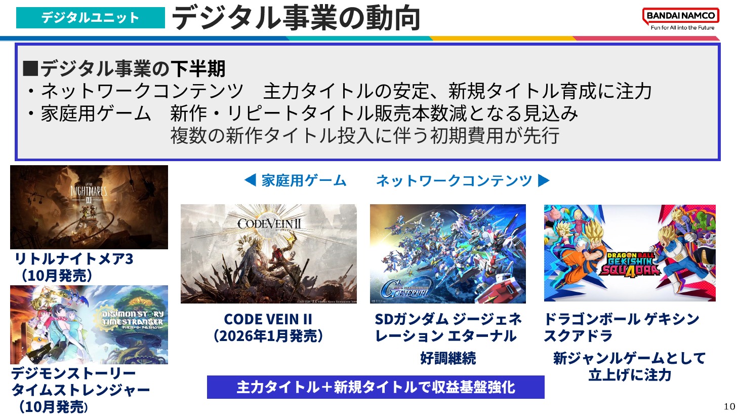 バンナムのゲーム事業は自社パブで内製のタイトルが全然出てこないのが問題ですね…まさかBNSIは任天堂の下請けばかりしていくつもりなのでしょうか。