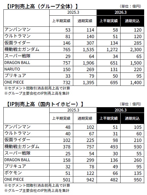 [バンダイナムコHD: 2026年3月期 第2四半期(中間期)決算短信〔日本基準〕(連結) / 補足資料 / 決算説明会プレゼン資料 / 通期連結業績予想の修正に関するお知らせ](pdf)