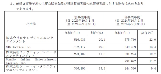 主要な販売先(取引額が全体の売上高の一割を超える相手)にデジタル版の販売先として任天堂は出てこず株SIEのみ、国内流通を担うKDEの売上高はやや増えるも株SIEに対する減収がそれを上回り、空の軌跡1stを海外で販売する雲豹娯楽とガンホーの売上高は増収するもその他欧米向け海外ライセンスタイトルを手がける任本位ッチソフトウェアアメリカはそれを上回る減収となっています。