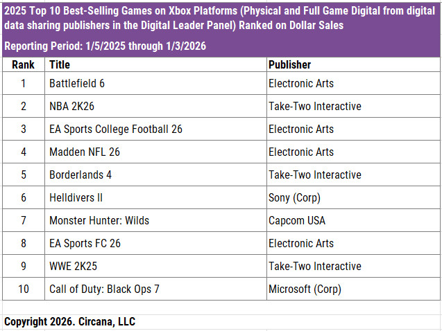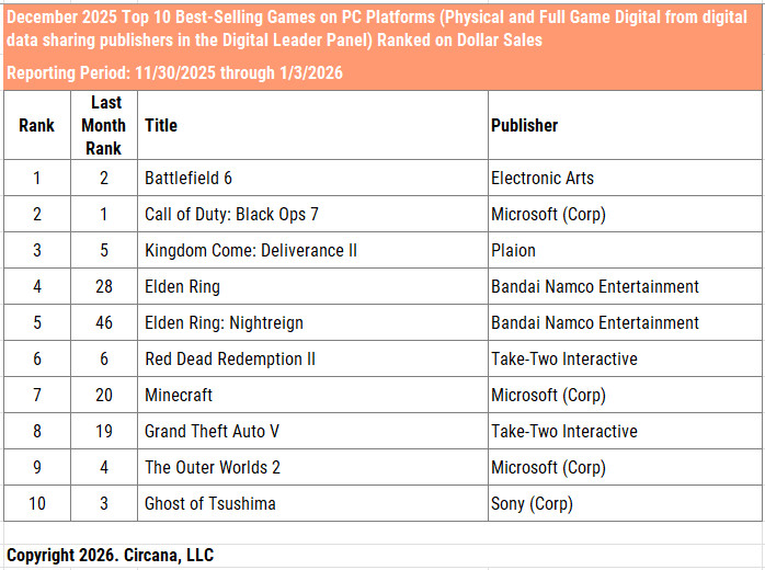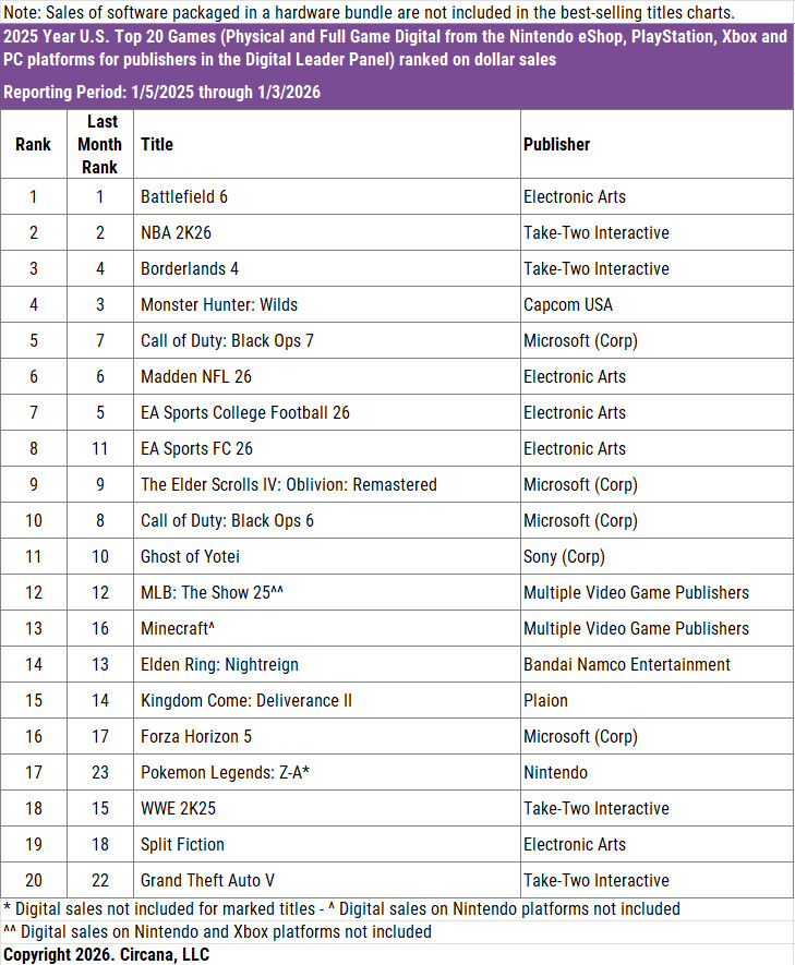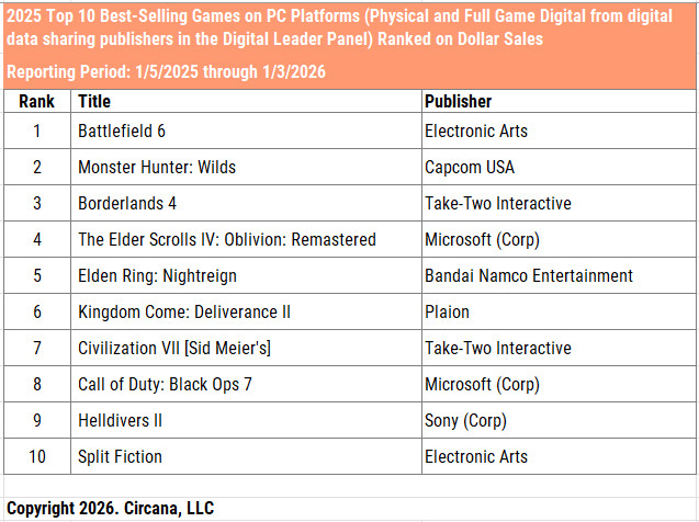 「Battlefield 6」が年間首位を獲得。
