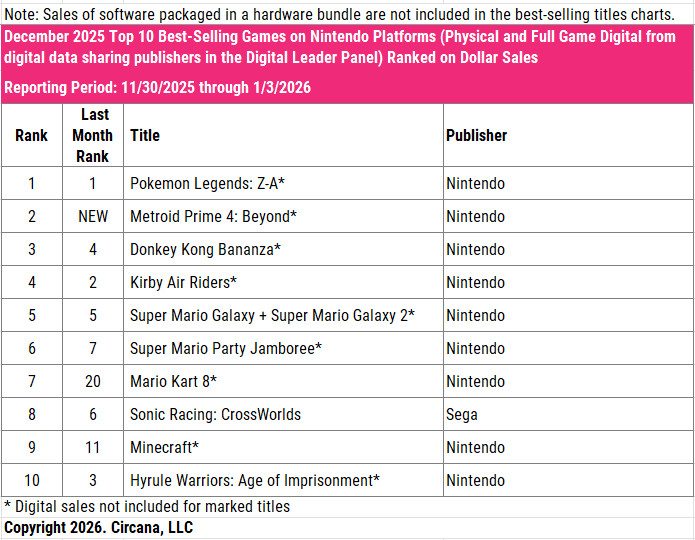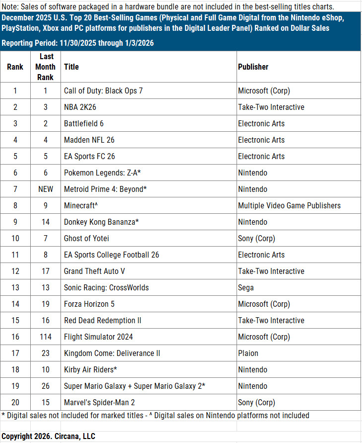 米Circana集計、2025年12月はゲーム市場全体の売上高が前年同月比3%増の77.65億ドル、ゲームコンテンツが3%増の59.33億ドル、ゲーム機が6%増の12.07億ドル、周辺機器が7%減の6.25億ドルという結果に。