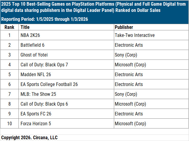 PSプラの2025年間Top10はこのような結果となっており、NBA2K26が首位、BF6が2位、羊蹄之怨霊が3位などといった結果に。
