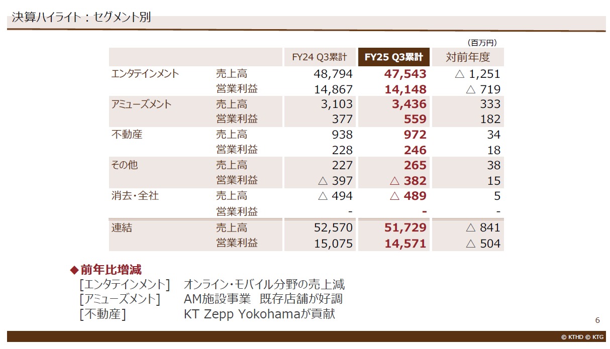 ゲーム事業が減収減益、その分をある程度AM施設事業が埋める格好となっているようです。