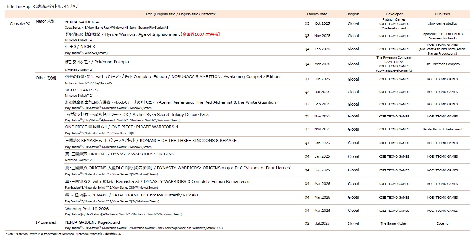 『信長の野望覇道』は12月に3周年を記念したキャンペーン等を実施し、10月に台湾、香港、マレーシア地域にて新たにサービスを開始しております。パッケージゲームでは『三國志8 REMAKE with パワーアップキット』(2026年1月29日発売予定。PS5、PS4、Nintendo Switch(※2)、Windows(Steam)用)と『Winning Post 10 2026』(2026年3月26日発売予定。PS5、PS4、Nintendo Switch 2(※2)、Nintendo Switch、Windows(Steam)用)を発表しました。