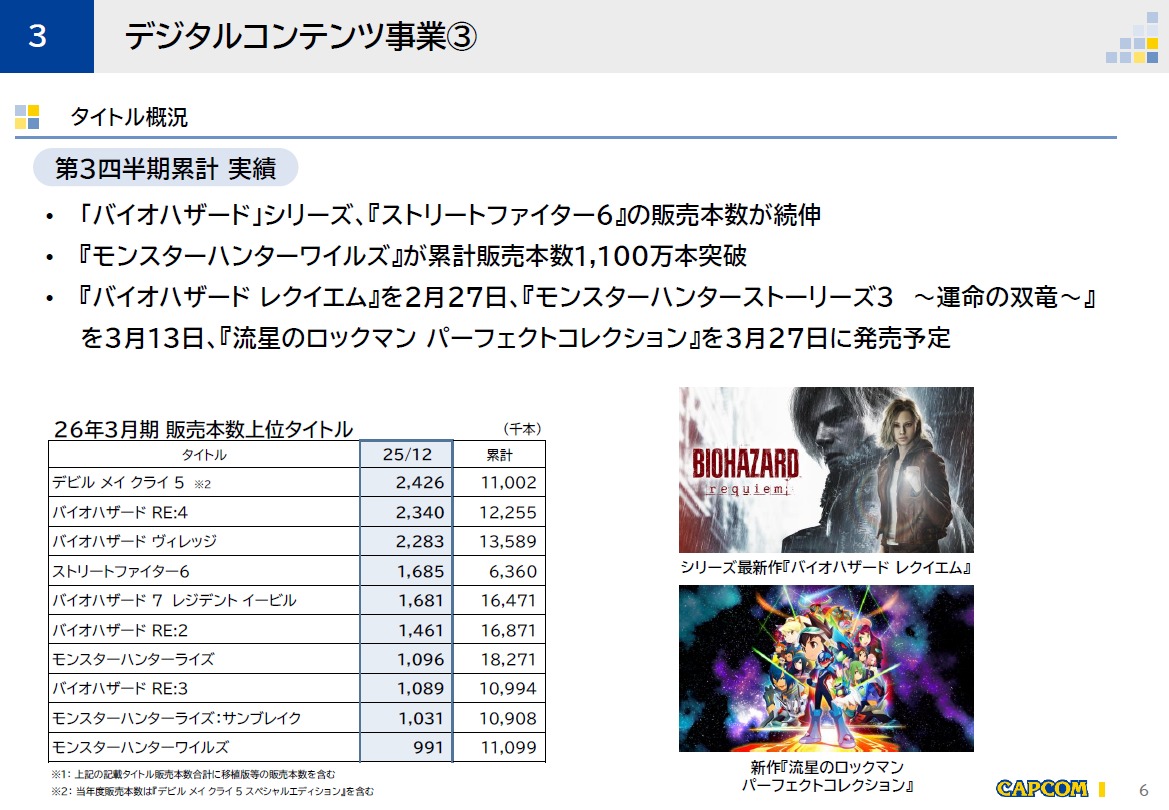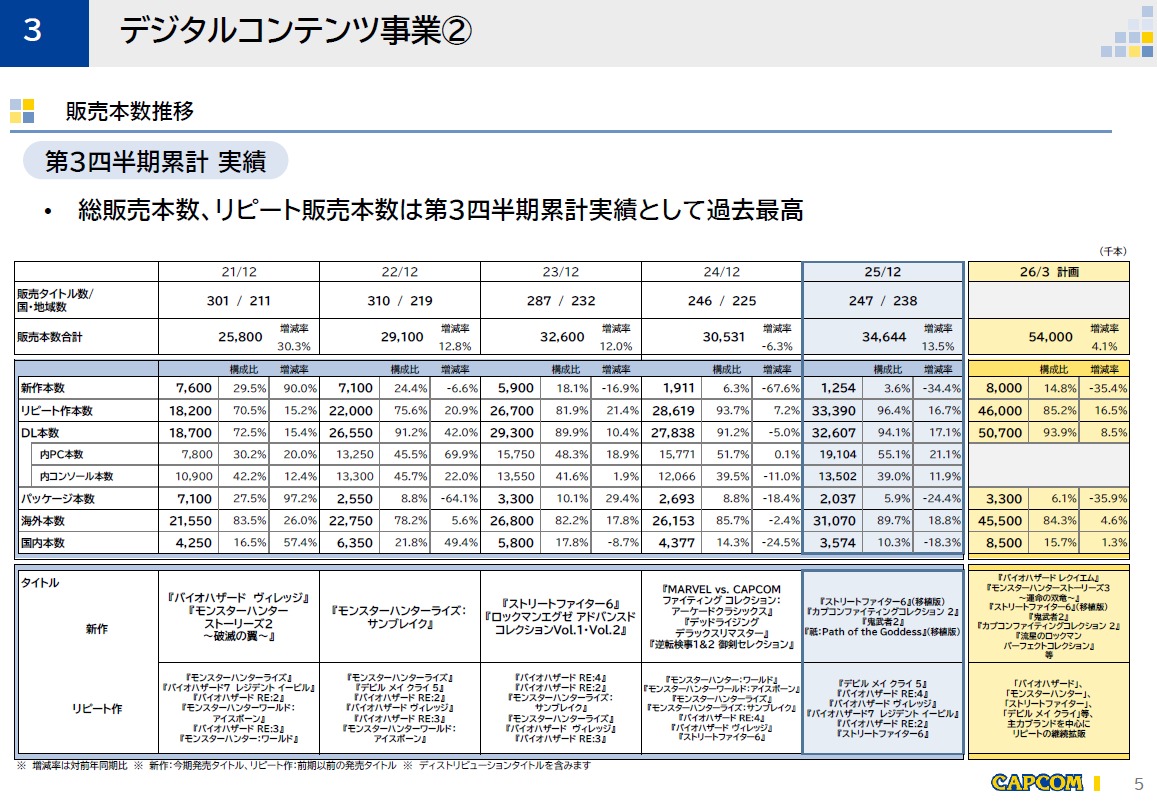 リピートタイトルにおいては、『ストリートファイター6』について、新型ゲーム機への展開に加え、引き続きeスポーツ展開との連携等によるブランド認知とユーザー数の拡大を推し進めたことなどにより、累計販売本数が全世界で600万本を突破しました。また、今年2月発売の主力シリーズ「バイオハザード」の最新作『バイオハザードレクイエム』への期待感の高まりが後押しとなり、『バイオハザードRE:4』および『バイオハザードヴィレッジ』をはじめとした同シリーズタイトルの販売が続伸しました。加えて、『デビルメイクライ5』が映像作品との連携による価格施策や、IPの認知拡大によるブランド価値向上を図ったことにより好調に推移したほか、前期2月発売のシリーズ最新作『モンスターハンターワイルズ』の累計販売本数が1,100万本を突破し、同シリーズの過去作『モンスターハンターライズ』および『モンスターハンターライズ:サンブレイク』が引き続き販売本数を伸ばしました。その結果、リピートタイトルの販売本数は3,339万本と前年同期2,861万本を上回り、収益を押し上げました。