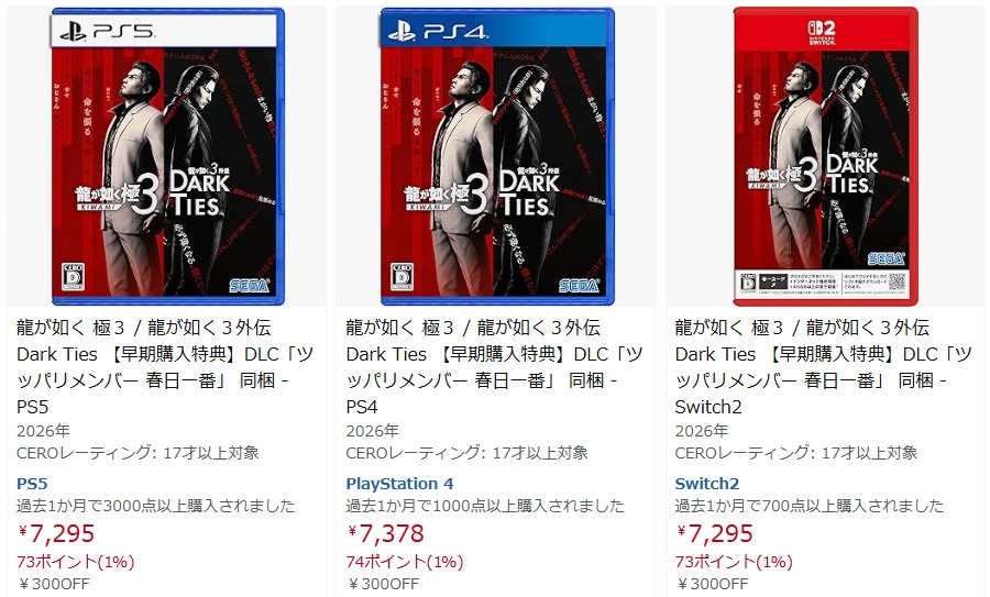 ・PS5 2/12 龍が如く 極3 / 龍が如く3外伝 Dark Ties 【早期購入特典】DLC「ツッパリメンバー 春日一番」 同梱 (Amazon)