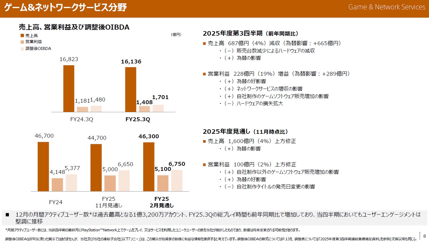 ゲーム&ネットワークサービス(G&NS)分野の第3四半期単独での結果は減収増益、ですが為替影響を取り除くと大幅減収、やや減益となっていた所ですね。
