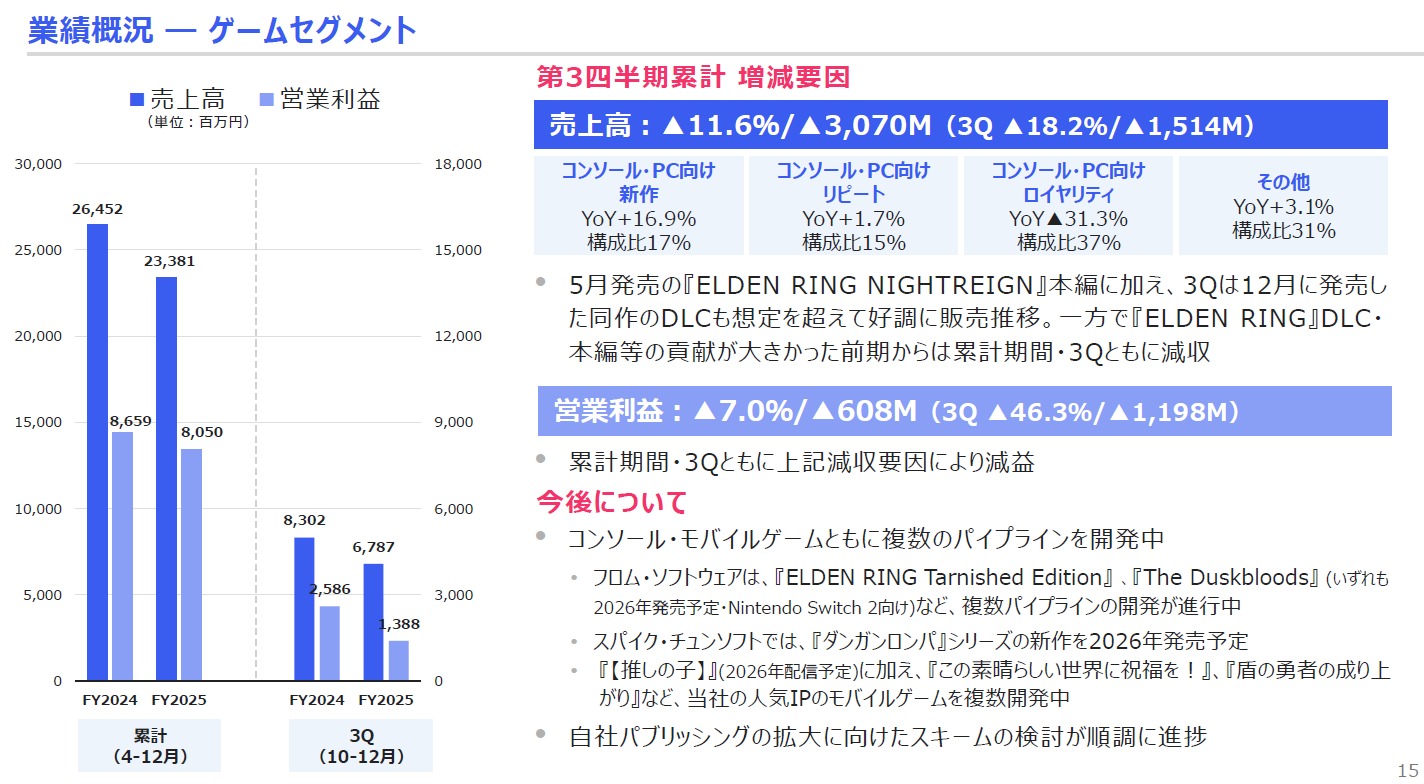 ㈱フロム・ソフトウェアが発売した新作『ELDEN RING NIGHTREIGN』の国内外の販売が好調に推移したものの、『ELDEN RING SHADOW OF THE ERDTREE』の販売及び『ELDEN RING』本編のリピート売上が好調だった前期からは減収となりました。