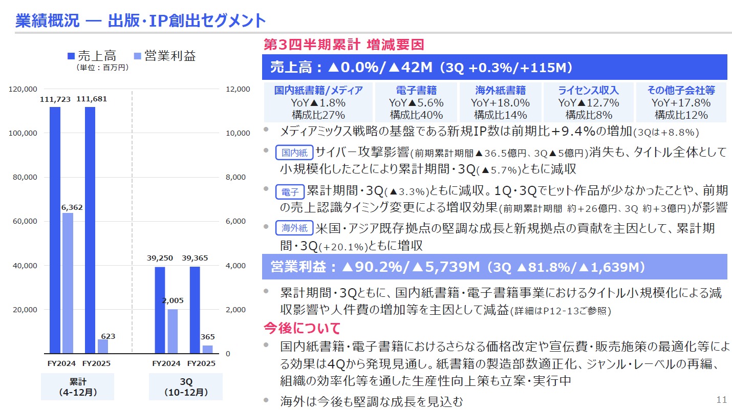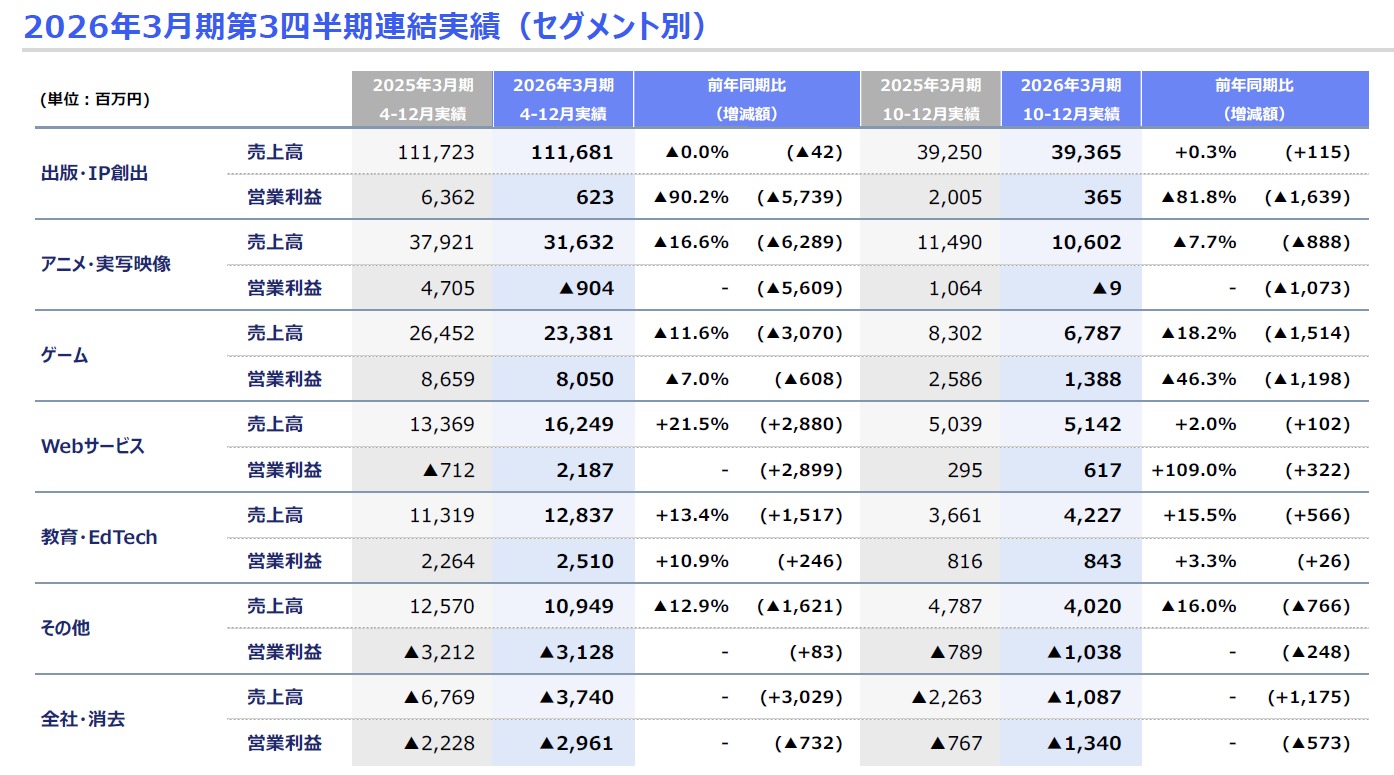 事業別では出版・IP創出事業が売上高は横這いな物の営業利益が九割減。