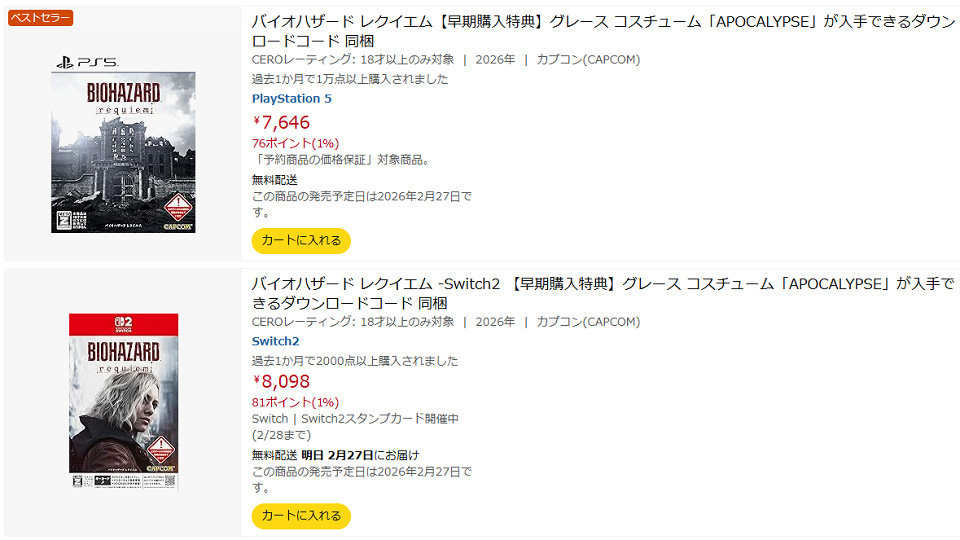 ・PS5 2/27 バイオハザード レクイエム【早期購入特典】グレース コスチューム「APOCALYPSE」が入手できるダウンロードコード 同梱 (Amazon)