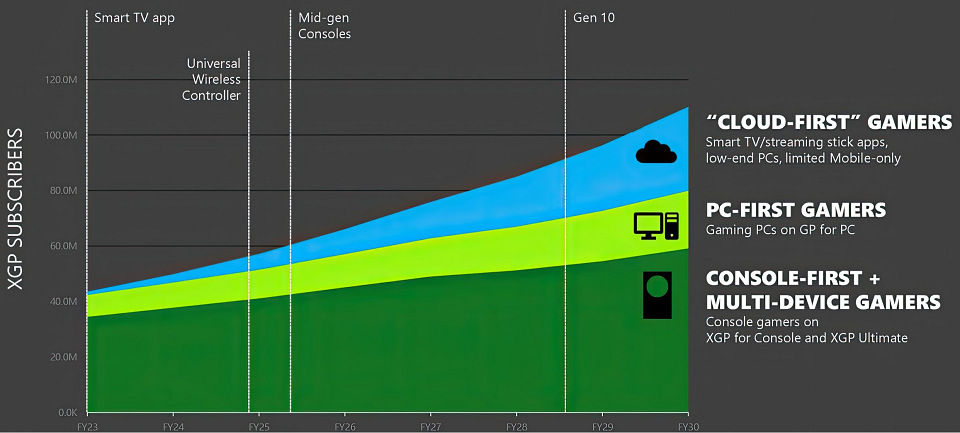 ちなみにこれがMSがセルフお漏らしした今世代~次世代にかけてのゲーパス契約者数計画ですが、次世代機に移行した後も半数以上がゲーム機からの契約って想定だったんですよね。